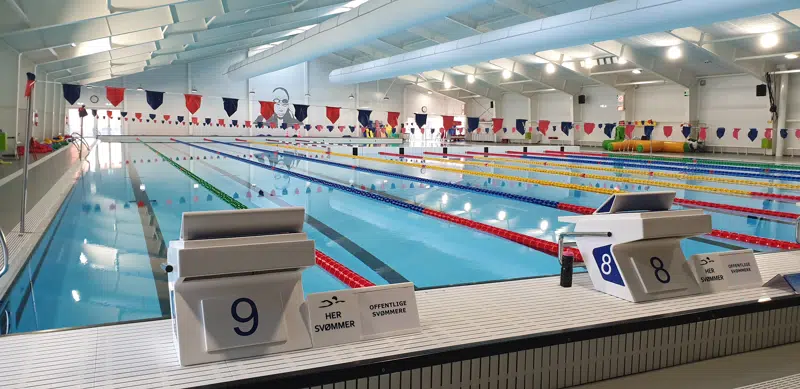 3. 6 x 25 meter baner, 6 x 24,5 meter baner og 4 x 50 meter baner (4 af 24,5 meter banerne kan justeres med bunden)